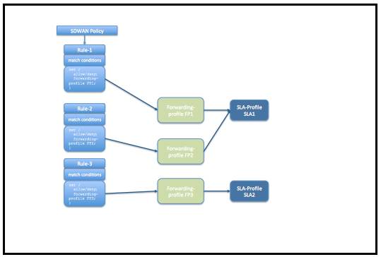 The Versa SDWAN policy consists of one or more rules. A rule is used to identify traffic for which we want to specify path selection behavior. Traffic matching a rule is subject to steering according to the forwarding profile associated with it. Traffic that does not match a specific rule is subject to default behavior.