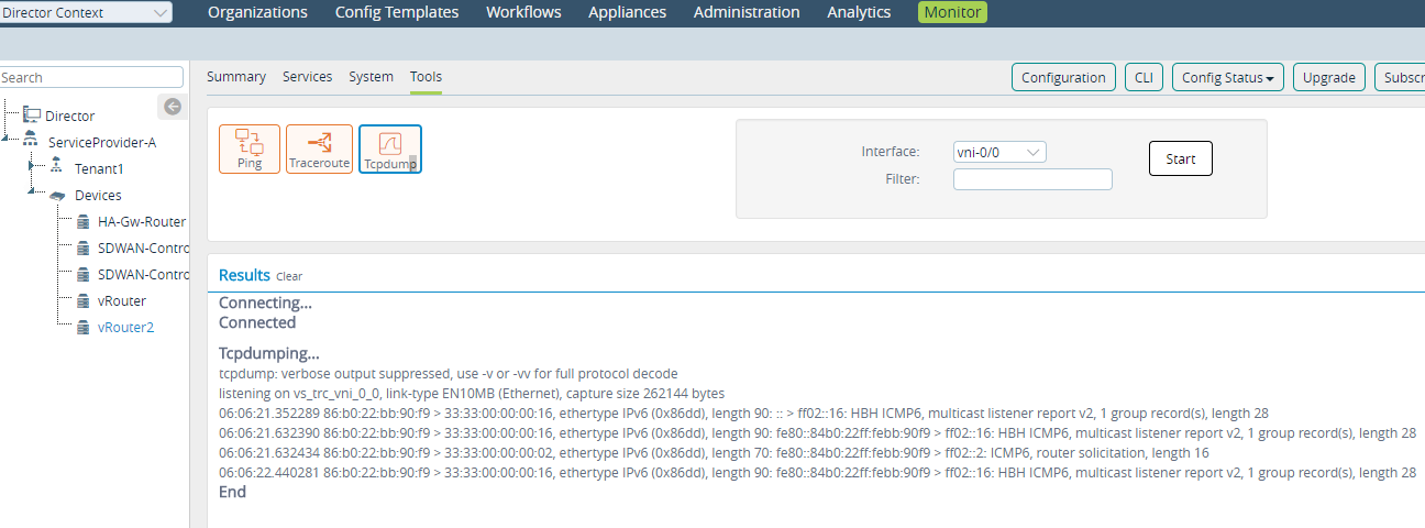 The tcpdump, ping, and traceroute functions do not activate when we click Start/Stop from the Monitor tab in the Versa Director.