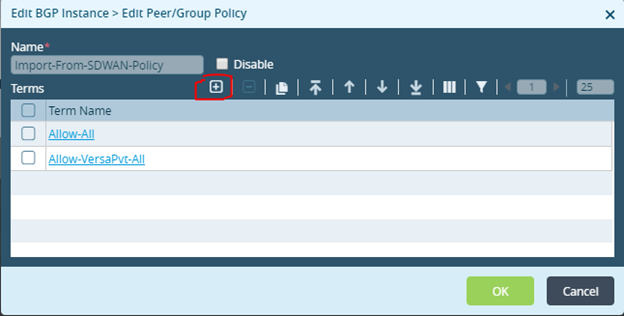 - Select EditBGP Instance > Edit Add Peer/Group Policy > Edit Add Term > Action tab and select Reject from Accept/Reject drop-down menu and click OK.