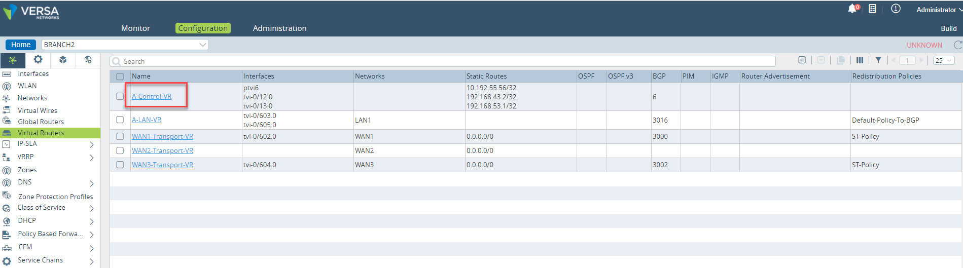 - In the Versa Director, Select an appliance > Configuration > Networking > Virtual Routers > Tenant Control-VR