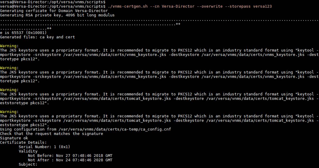 Execute the Command : /opt/versa/vnms/scripts/vnms-certgen.sh --cn Versa-Director --overwrite --storepass versa123