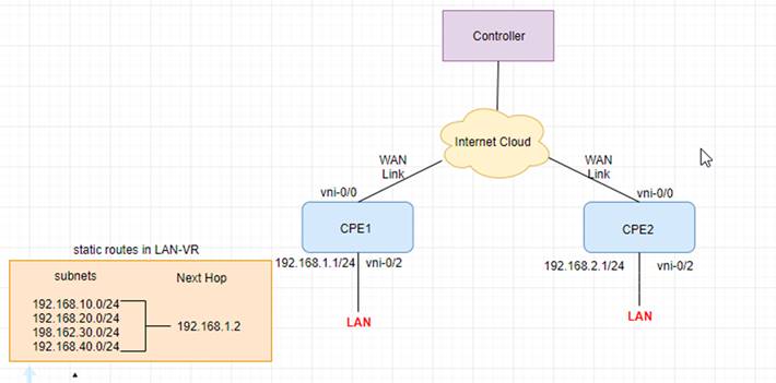 We have four subnets and we have defined static route to each subnet in Branch1 LAN-VR. We want to advertise first two subnet to Branch2 through SDWAN.