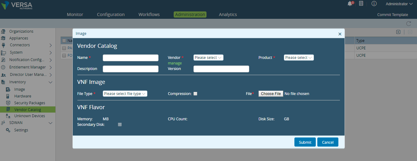 The first step of uCPE creation in the director is to upload the vendor catalogue. Director should have Vendor Image for uCPE.