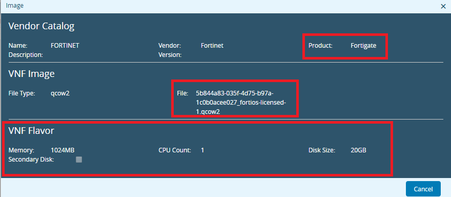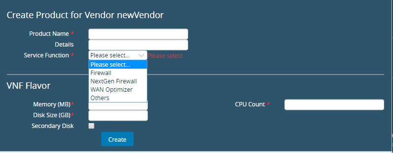 - Once you select Vendor & Product, all the predined fields like CPU count, Memory & Disk Size, description and the version number of the VNF are populated. In this example, we have selected Service Function as NextGen Firewall.