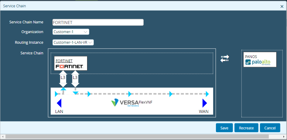 - There will be Egress (FORTINET-WAN-Side-Intf__ucpeWanIntAddress) and Ingress(FORTINET-LAN-Side-Intf__ucpeLanIntAddress) interface address in the FlexVNF which is connected to the 3rd party VNF. If the VNF configured in L3 mode, then the next-hop (FORTINET-WAN-Side-Nexthop__ucpeWanNextHop) address also needs to be configured.