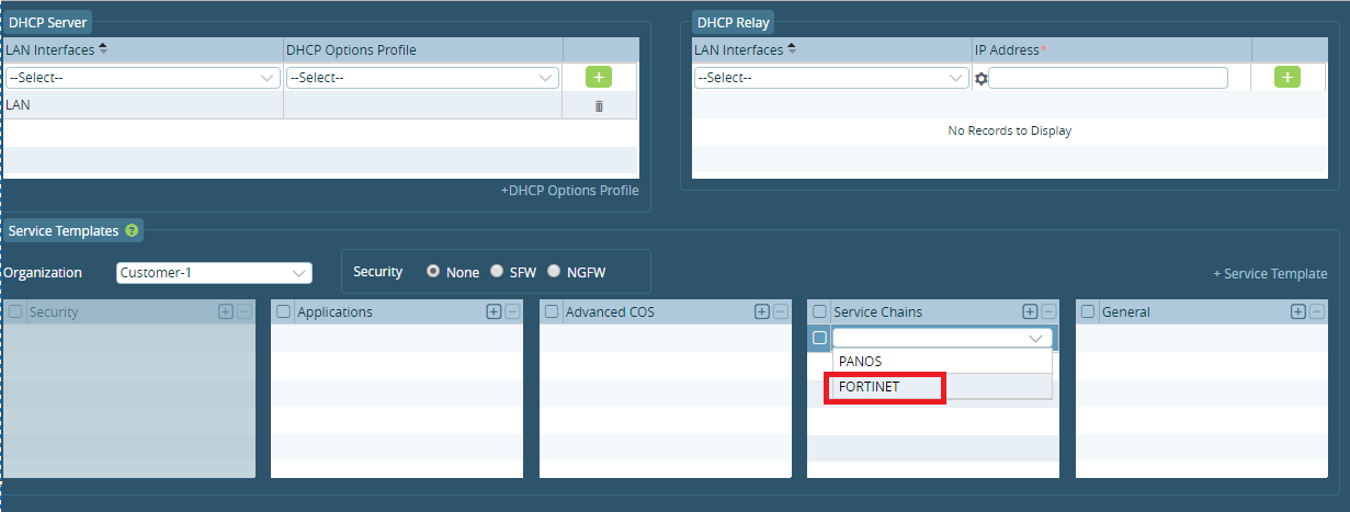 - Add Service Chain which is service chain template from Dropdown (in this example we select the Service Chain FORTINET that we defined in previous)