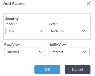 - Click (+) to add a security model. NOTE: Make sure the VACM Groups "Members Name" is same as community "Security Name" (sec-name), if configured in step 5.