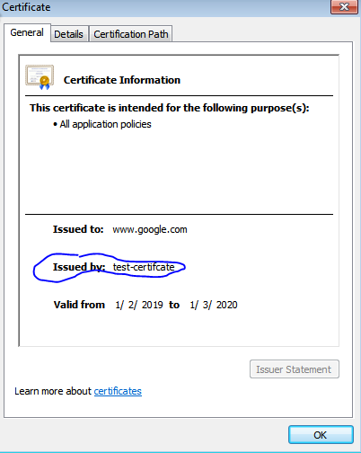 - Browse any https site and click on the key icon which is located beside the URL bar and click on “Certificate(Valid)”. You will see that ssl certificate is the one we have created.