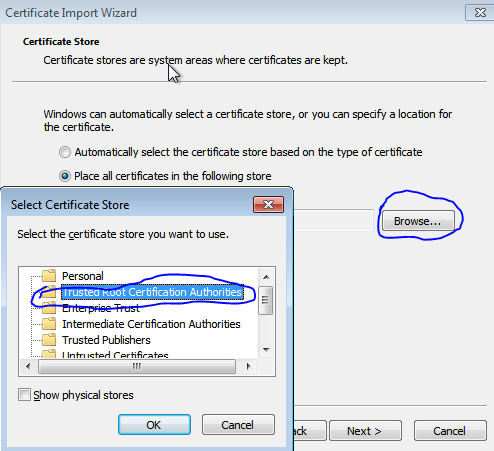 - Place the certificate to “Trusted Root Certificate Authorities”.