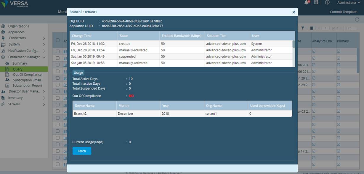 - In the Versa Director, navigate to Administrator > Entitlement Manager>Query to view the subscription details of a branch.