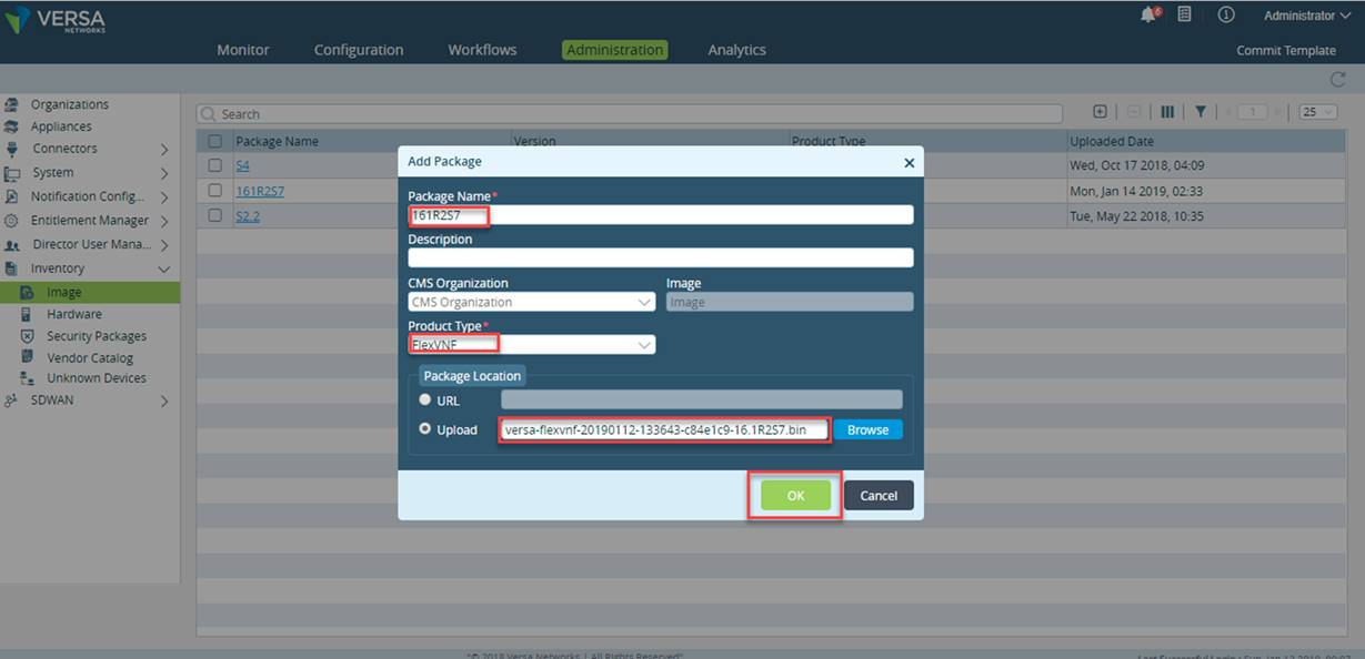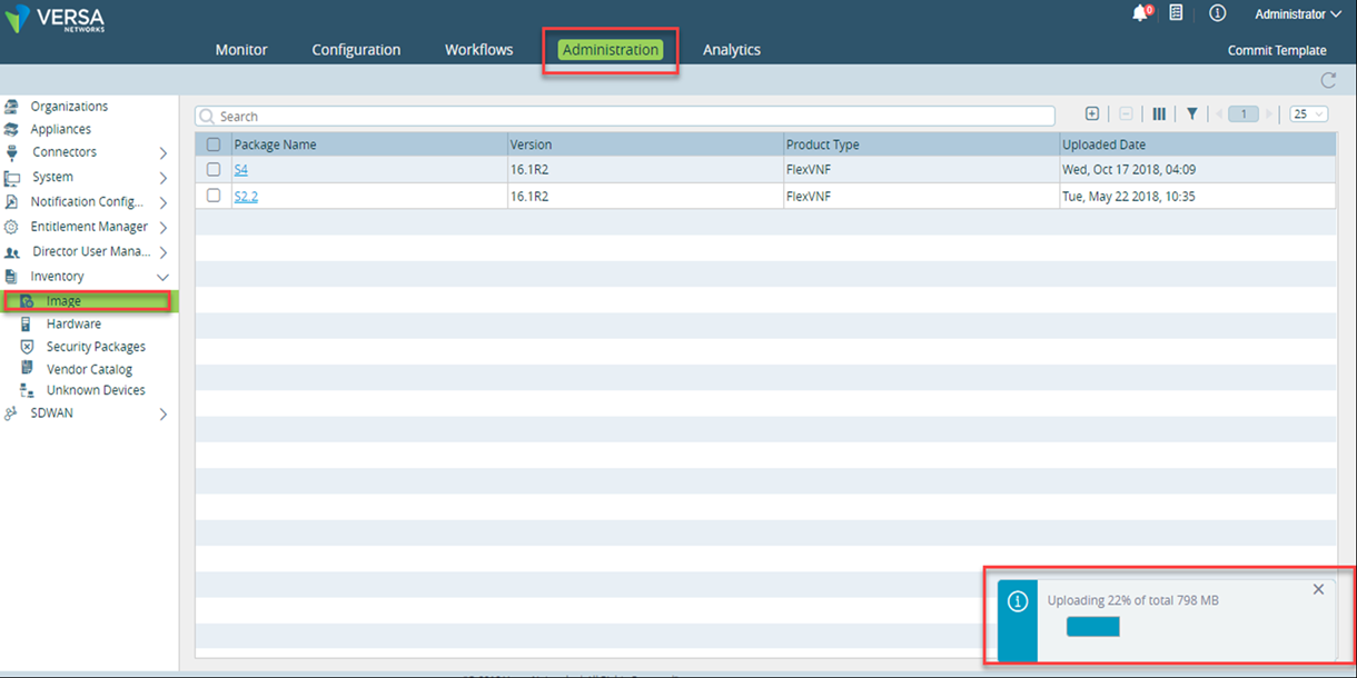 - You can view the uploaded package under Administration > Inventory > Image