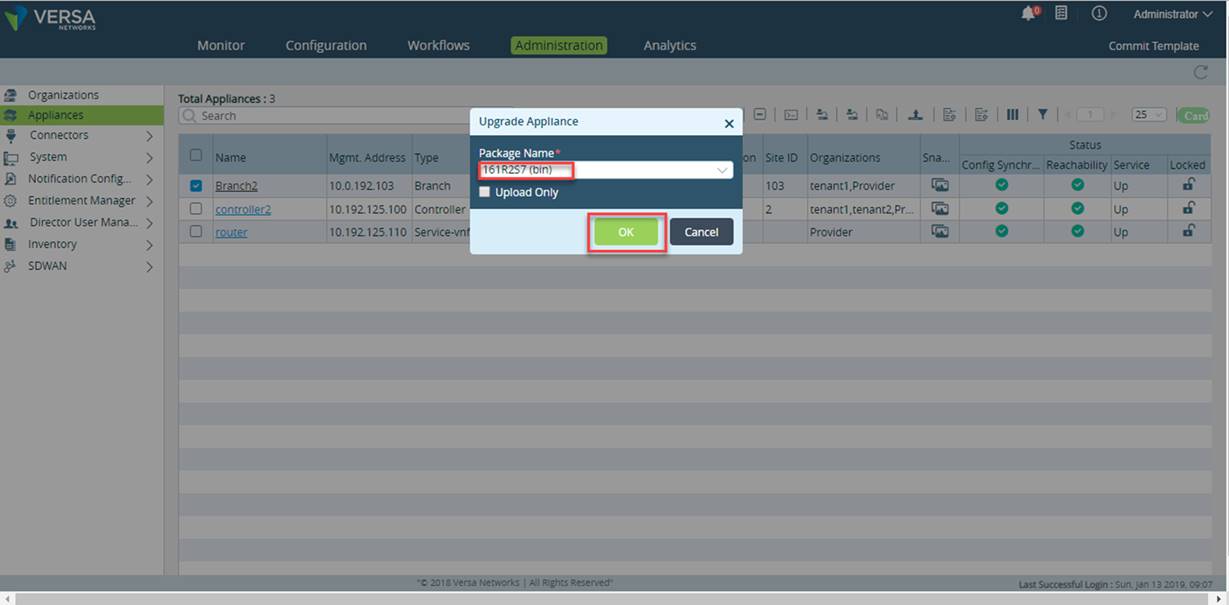 - In the Versa Director, navigate to Administration > Appliances and select the branch for which upgrade needs to be performed