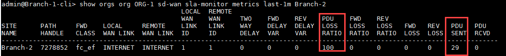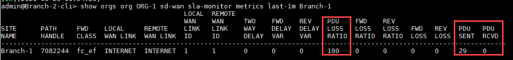 Here we can see SLA is down for INTERNET transport and also the PDU loss seen is 100%