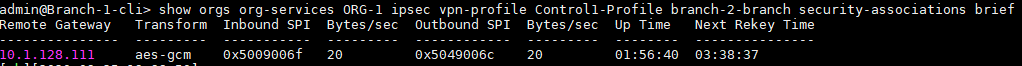 show orgs org-services <Org-name> ipsec vpn-profile <profile-name> branch-2-branch security associations brief