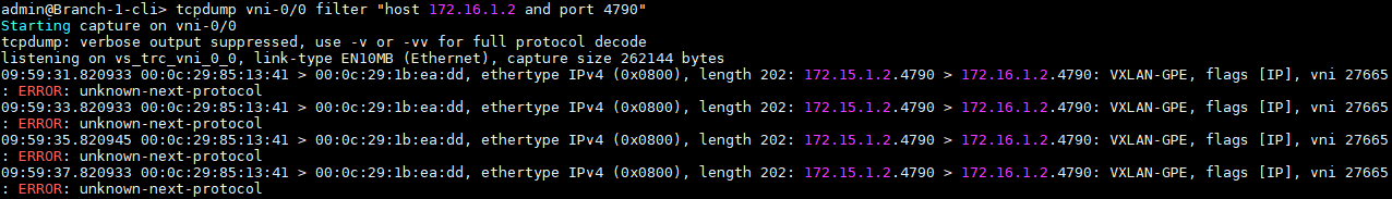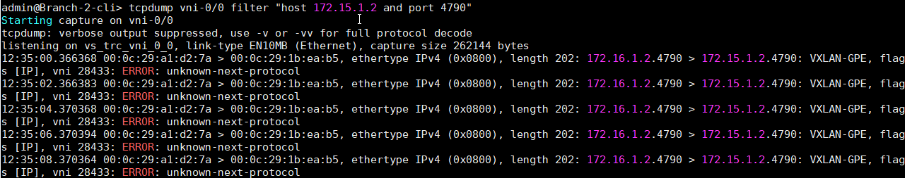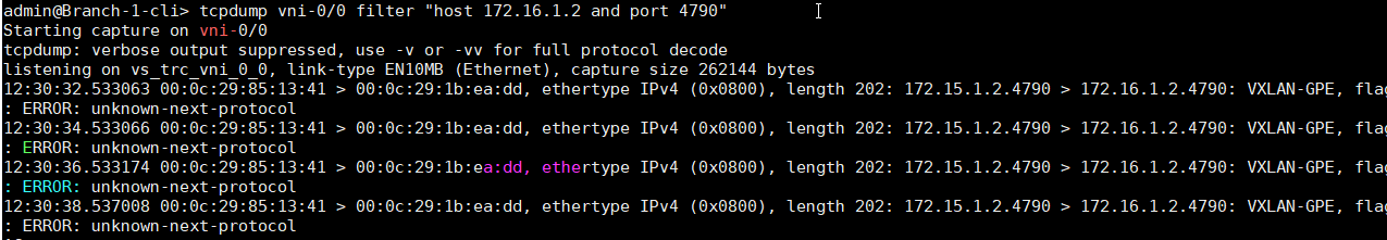 Run tcpdump on egress vni-0/x interface (transport) of Branch-2 Public IP and Public Port. Here we see traffic going out to Branch-2 but no return traffic. UDP 4790 dropped in both directions.
