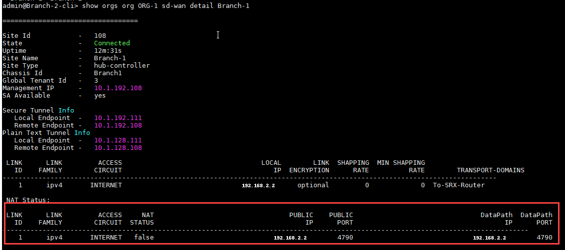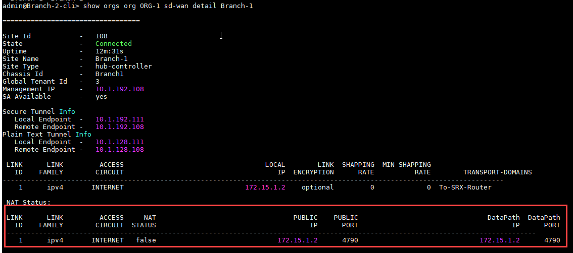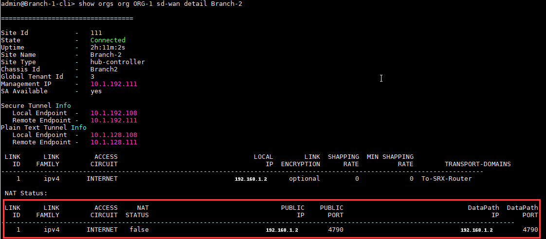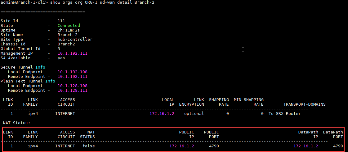 Below command can be used to know the Public IP and Public Port of the remote branch which will help to know the remote branch underlay connectivity details