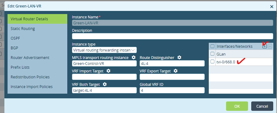 Similarly, add interface tvi-0/698 to Lan-VR.