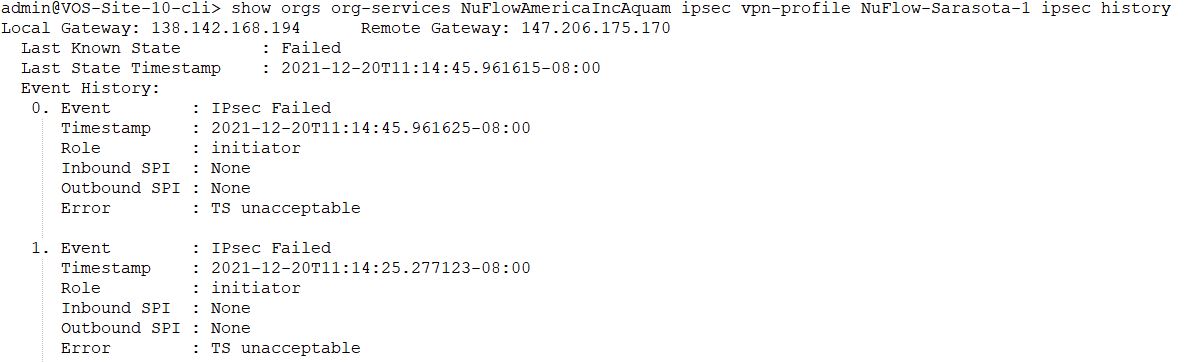 Use CLI 'show orgs org-services <org-name> ipsec vpn-profile <vpn-profile-name> ipsec history' to find phase-2 negotiation issues
