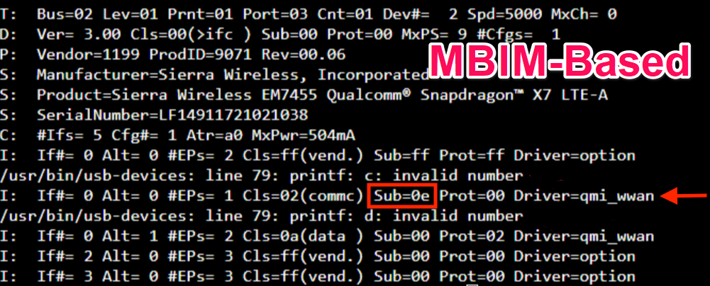 By entering the command usb-devices in the shell prompt, you can see the output similar to below. If you notice Sub value of 0e for qmi_wwan, in any of the last 5 lines, it means that the LTE mode is incorrectly configured to MBIM.