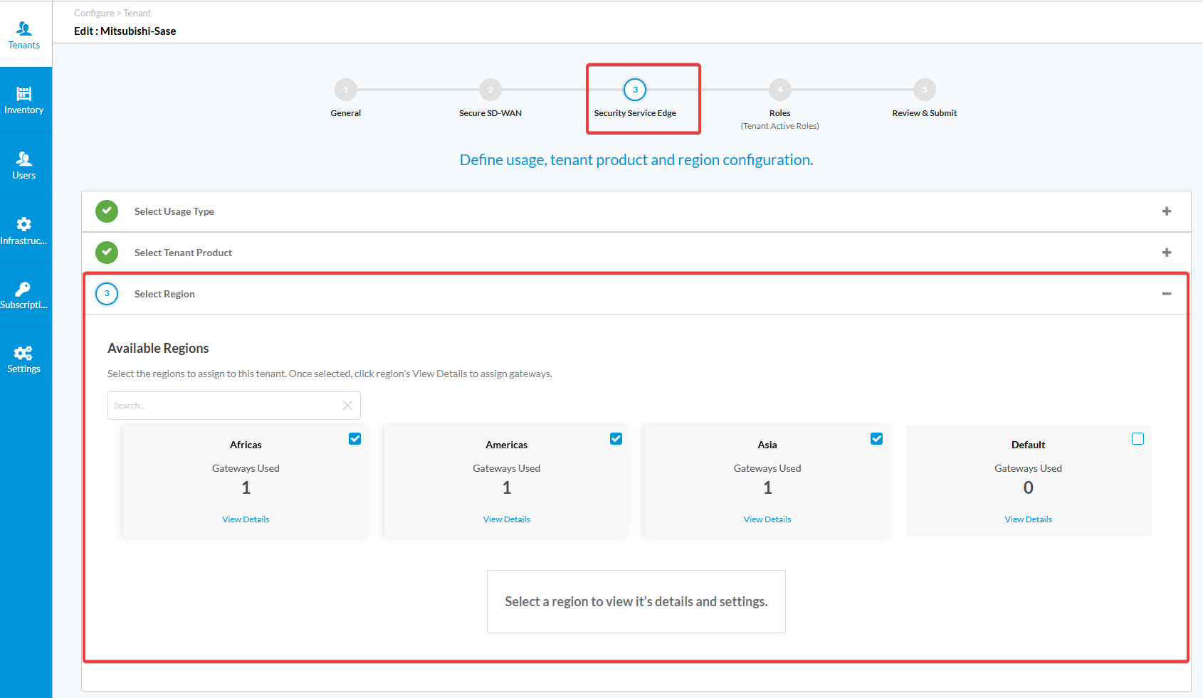6. Once step 4 and 5 are completed. Edit the tenant in Concerto to include SSE services. Fill the required Usage type, Tenant Product and at the Select Region, you will need to select the Gateways (Without performing Step 4 and 5, the Gateway will not be visible in Concerto Regions.) Select the Gateway and add required address-pool for the clients.