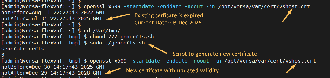 4. Check the certificate validity using "openssl x509 -startdate -enddate -noout -in /opt/versa/var/cert/vshost.crt"