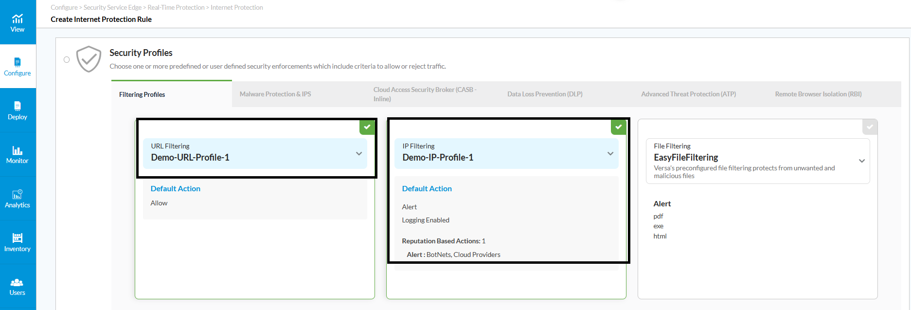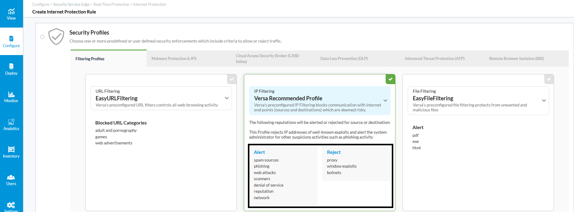 Internet or Private Protection Policies → Security Enforcement → Security Profiles → IP Filtering Profile