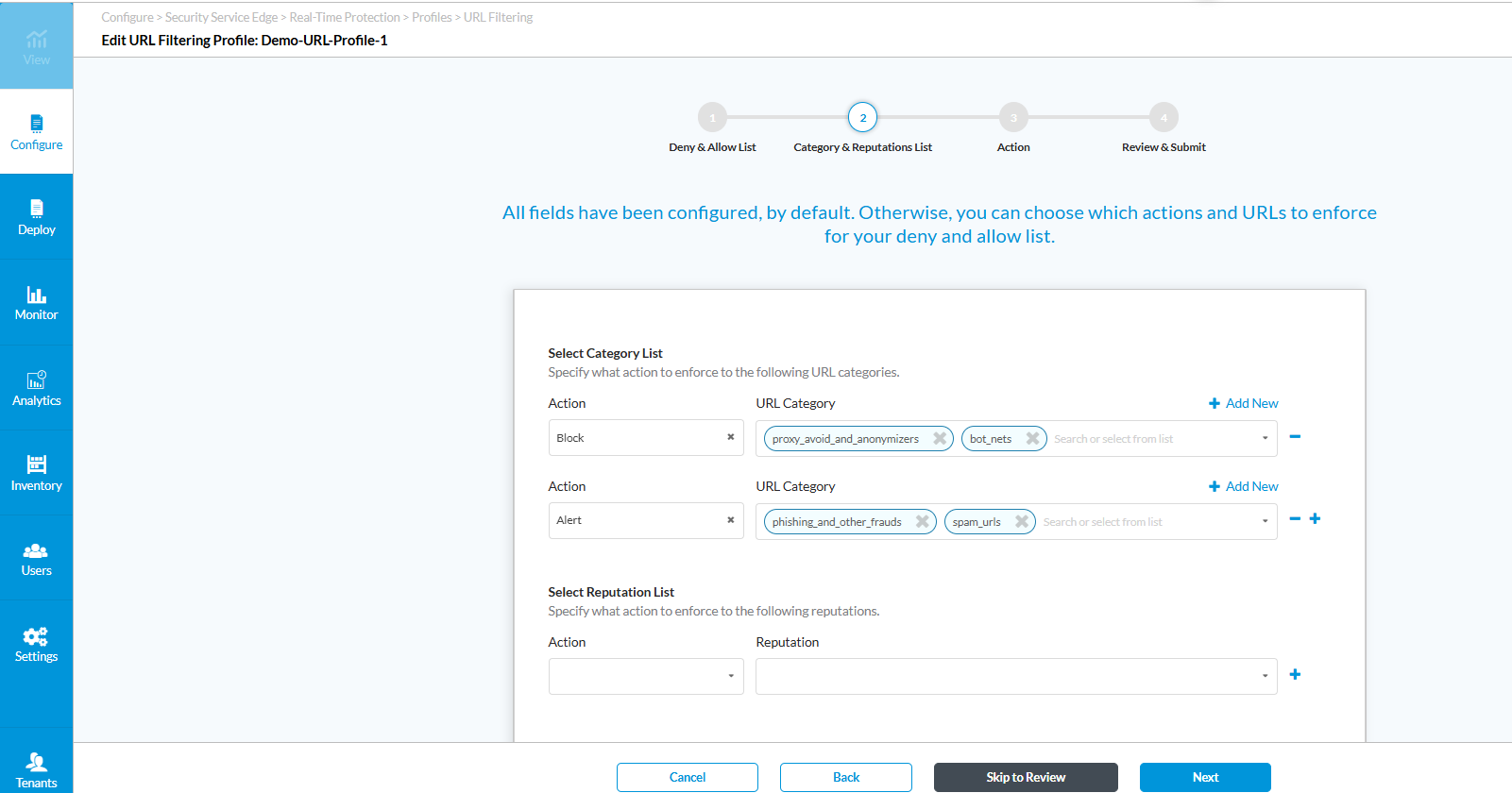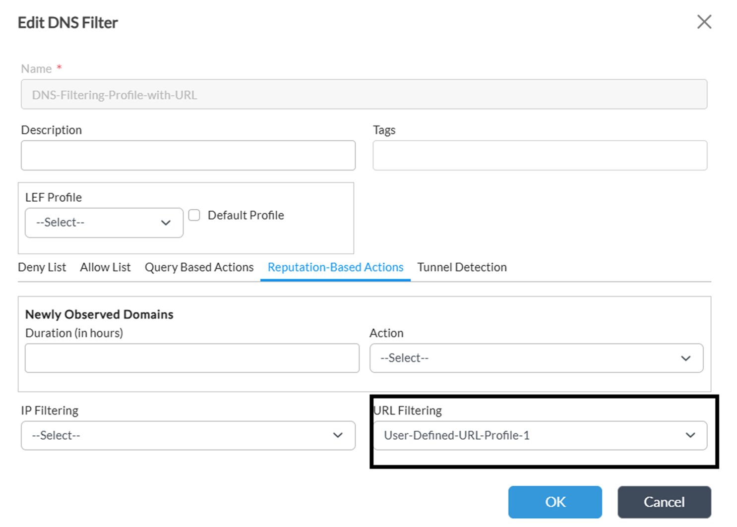 Create a custom URL Filtering profile that defines appropriate actions for the categories you want DNS Filtering to reference.