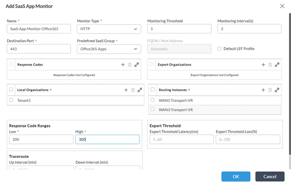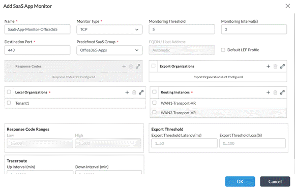 SaaS Application Monitor — Defines the application or destination to probe and the WAN routing instances (VRFs) to evaluate