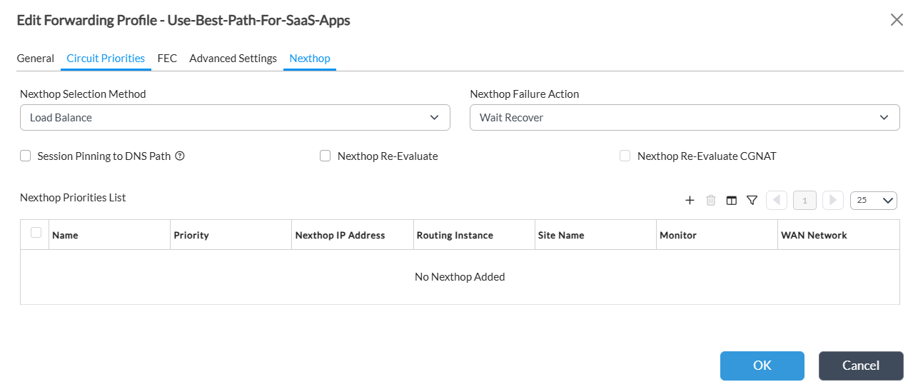 Figure 5: Forwarding Profile showing nexthop selection method with no nexthop priorities (If nexthop priorities not configured, the one configured in SaaS app monitoring WAN routing list will be used)