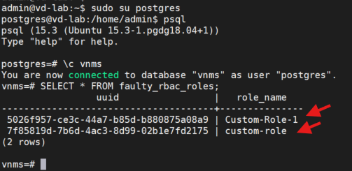 - vnms=# SELECT * FROM faulty_rbac_roles;