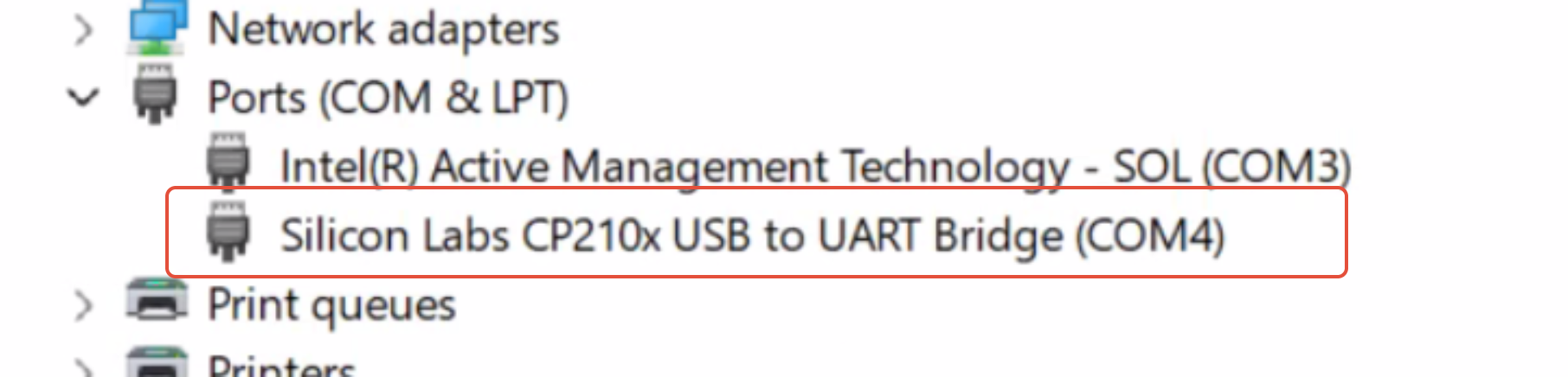 After installation, open Device Manager and expand Ports (COM & LPT). You should see a Silicon Labs CP210x USB to UART Bridge (COMx) entry. Use this COM port in your terminal application (e.g., PuTTY or SecureCRT) at 115200 baud.
