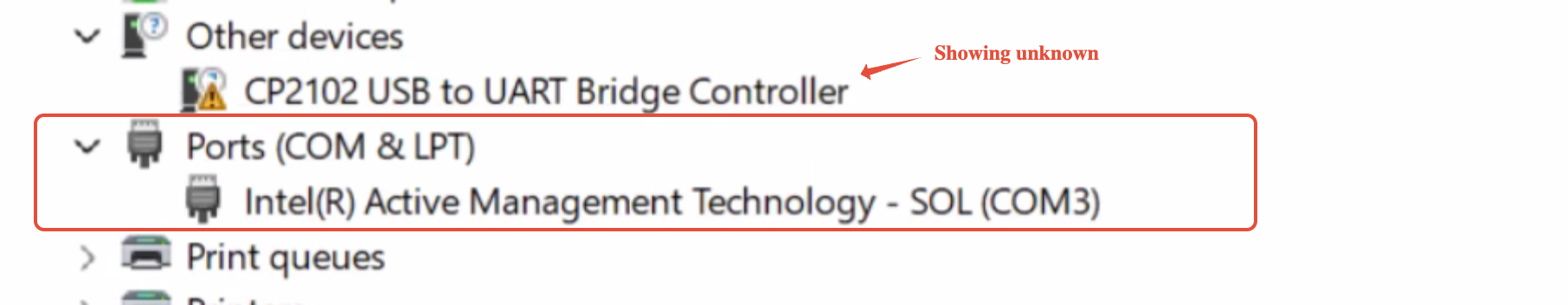 The Silicon Labs CP210x USB-to-UART bridge driver is missing. Modern Windows builds do not bundle this driver, so it must be installed manually.